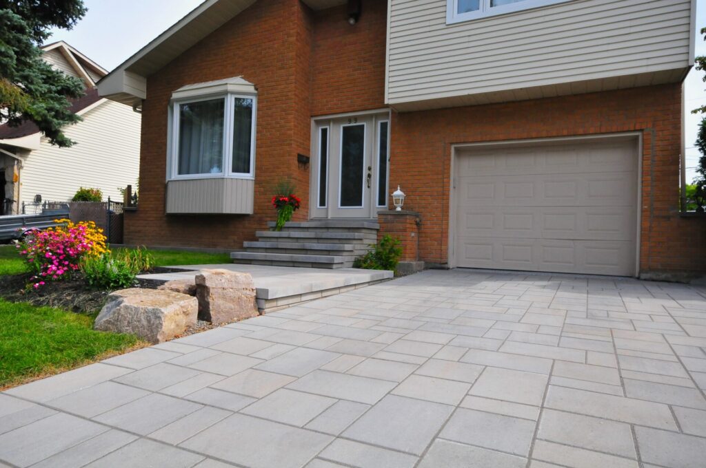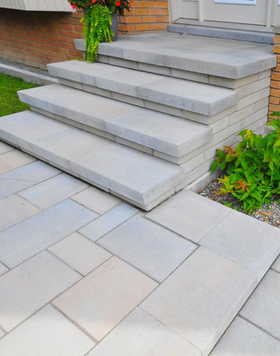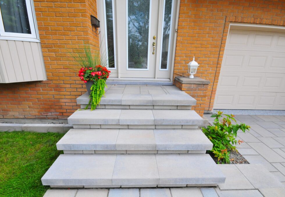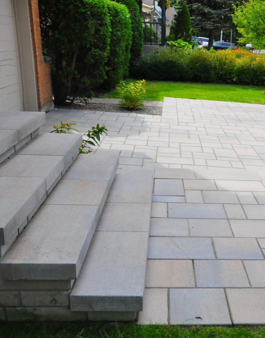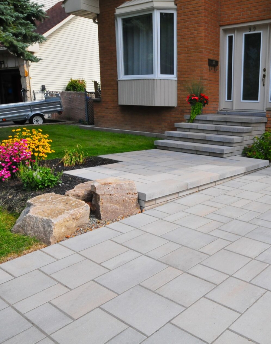 L’accès à l’entrée principale repose sur une dalle de béton solide et durable, qui sert de fondation. Les marches et murets, réalisés en blocs et couronnements Raffinato Gris Champlain définissent clairement les niveaux et assurent une circulation fluide.
