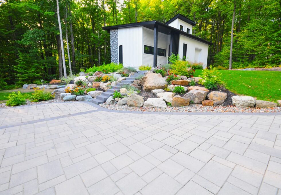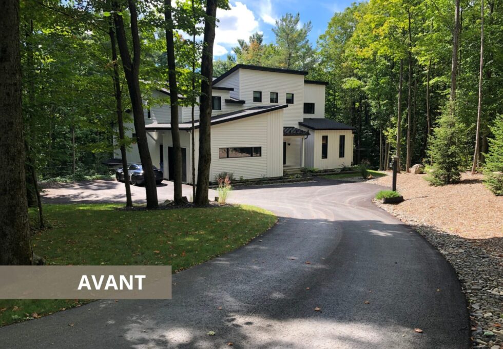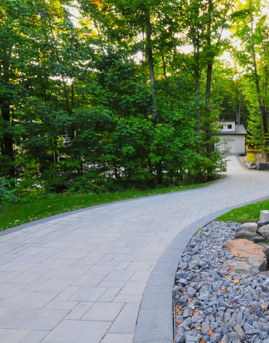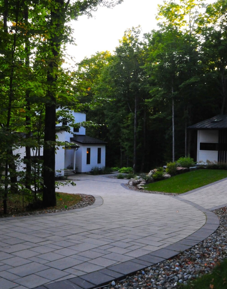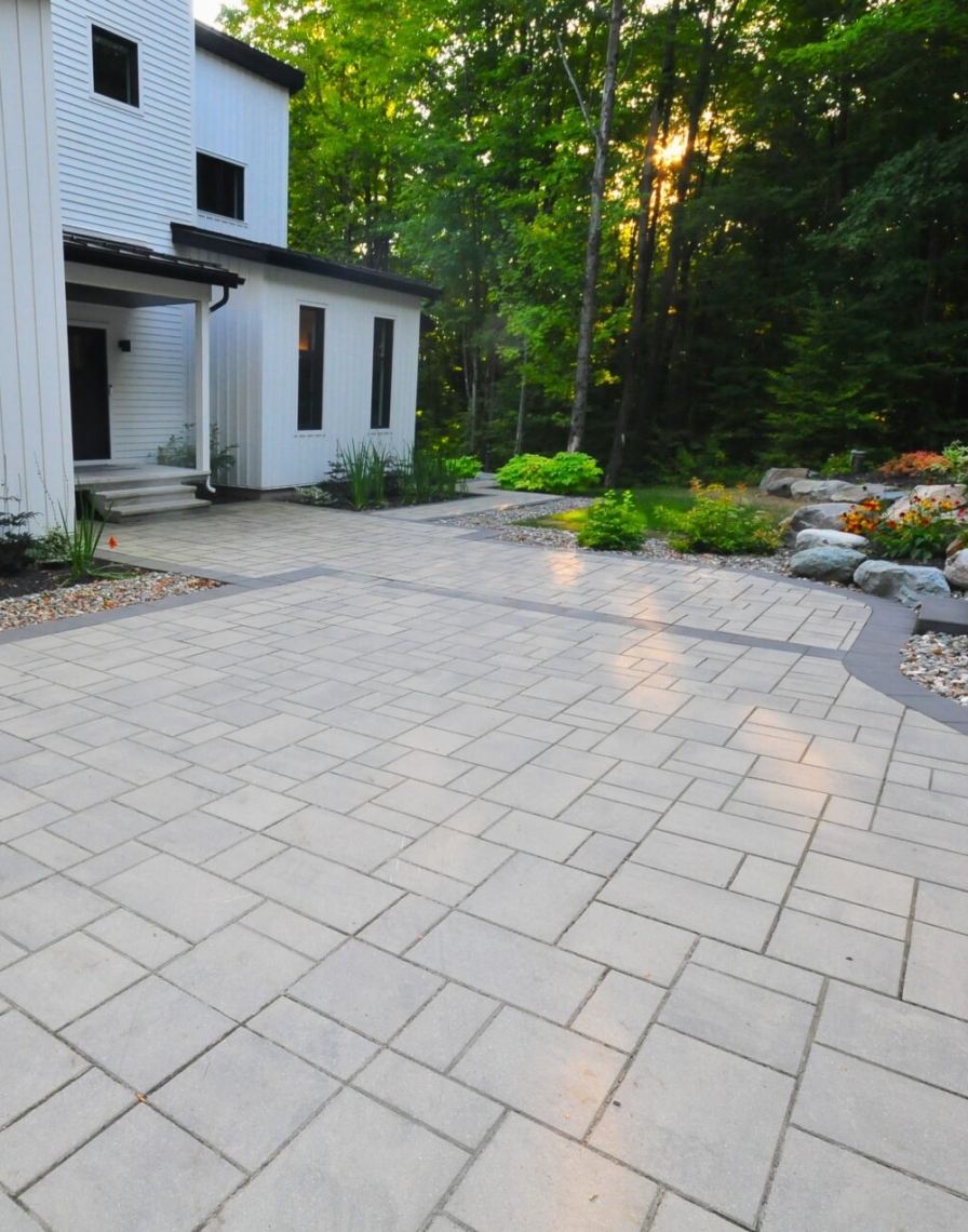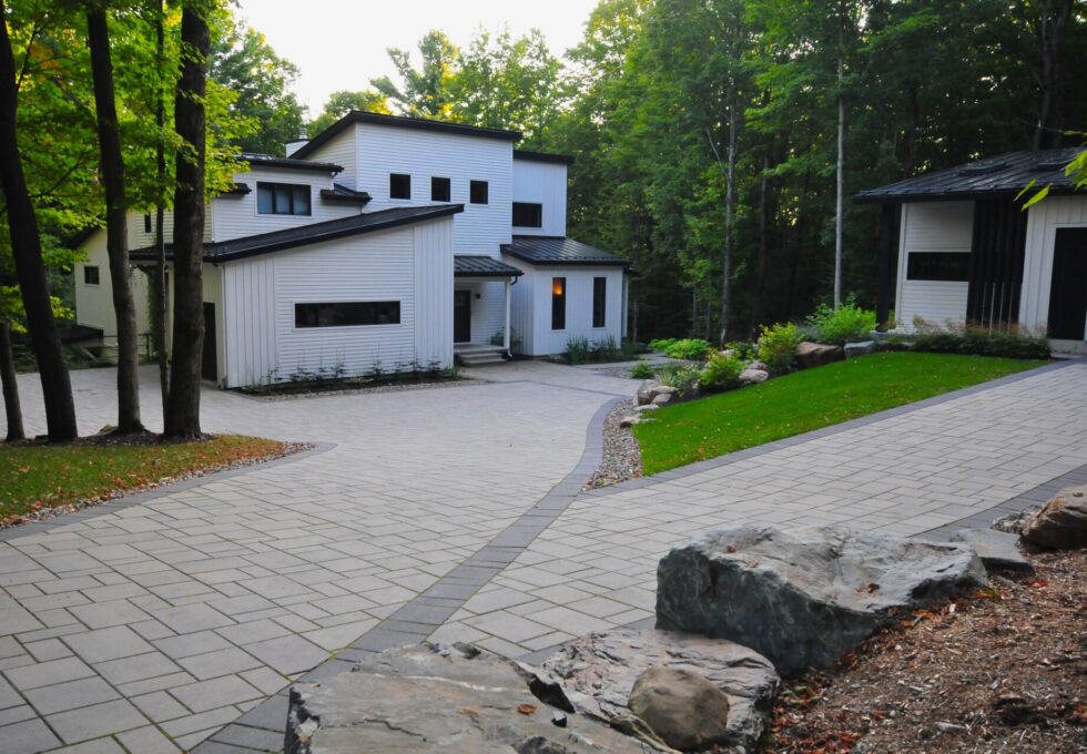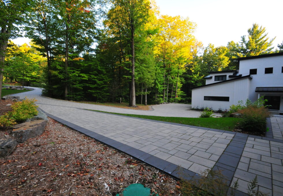 Située au cœur de Bromont, cette résidence se distingue par un aménagement à la fois imposant et parfaitement intégré à son environnement naturel. Le projet s’articule autour d’un vaste stationnement entièrement réalisé en pavé Blu de Techo-Bloc, dans une élégante teinte Gris Calcaire, subtilement soulignée par des bordures Noir Onyx. Ce contraste raffiné apporte du caractère à l’ensemble tout en conservant une esthétique sobre et intemporelle.