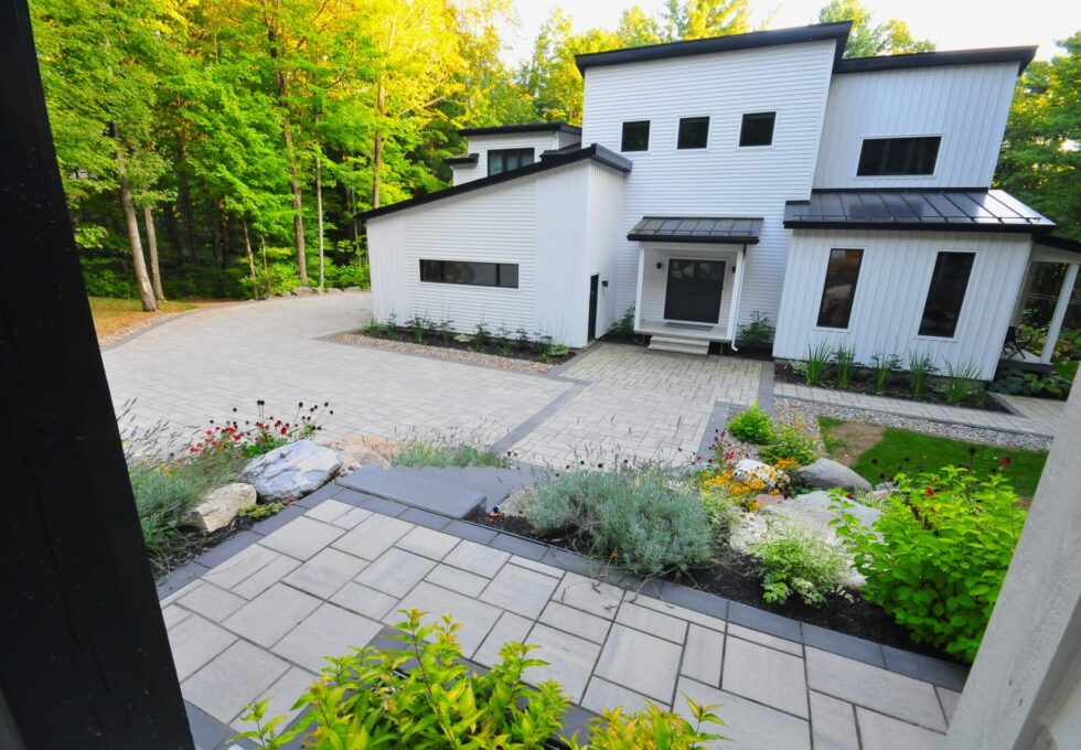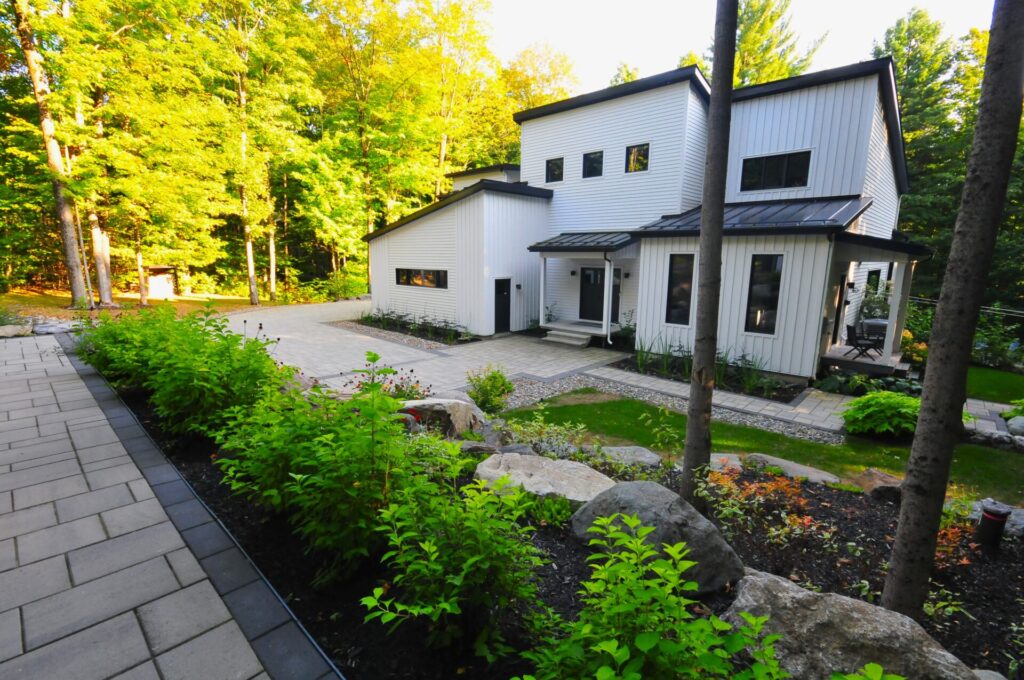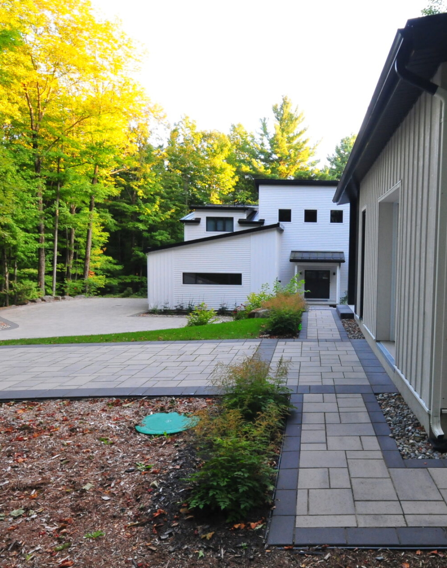 Pensé pour allier fonctionnalité et esthétisme, le stationnement offre un accès direct à la maison principale ainsi qu’à l’atelier situé à droite de la résidence. Cette configuration optimise les déplacements au quotidien tout en structurant harmonieusement l’espace.