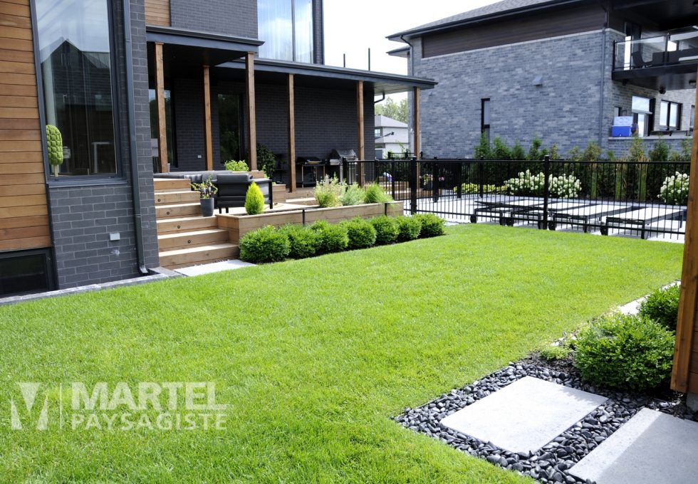 Véritable prolongement de la résidence, cette cour arrière est en parfaite harmonie avec l’architecture du bâtiment. Les nouvelles terrasses en dalles rectangulaires de grand format offrent une belle vue sur la piscine. La proximité du coin-repas, de l’aire de détente et de la zone piscine crée un élément rassembleur près de la maison, qui donne envie de profiter du confort de la cour arrière en toute saison. Le caractère à la fois classique et moderne de la végétation souligne judicieusement chaque ligne et chaque élément décoratif de l’aménagement paysager. Le concept de design de la façade est très linéaire par la pose des pavés dans l’entrée d’auto et par les végétaux devant le balcon avant. Un aménagement digne des tendances d’aujourd’hui.