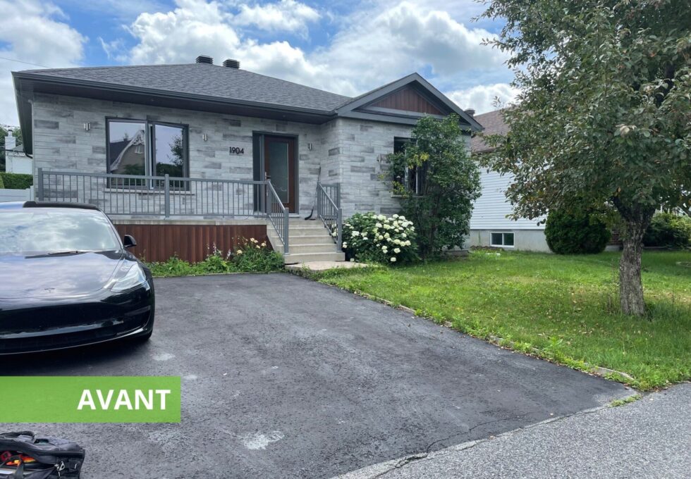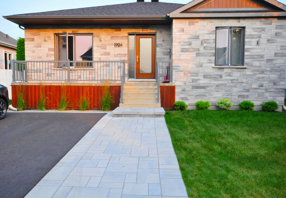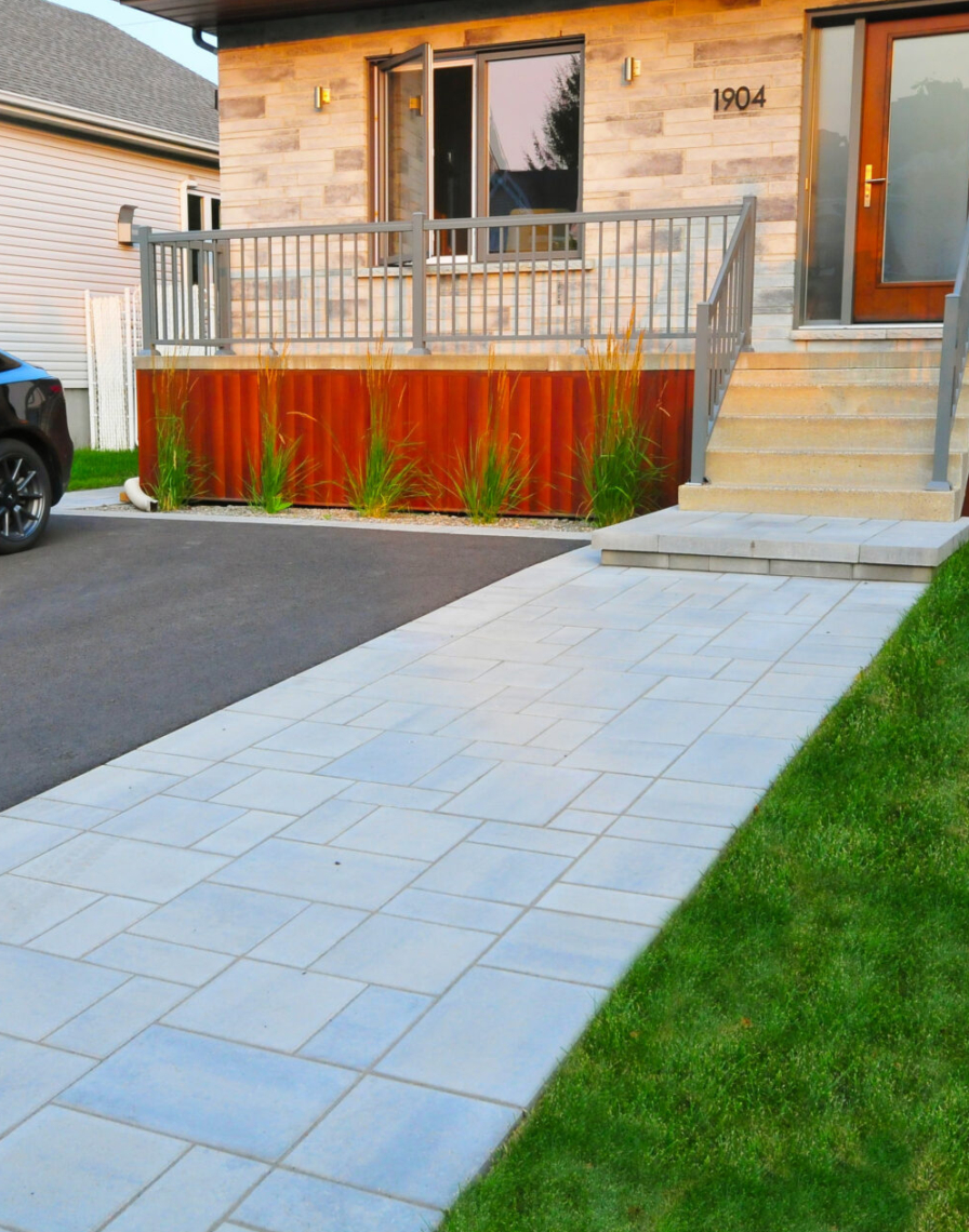 En façade, un trottoir central en pavé Blu au fini lisse, couleur Gris Calcaire, guide naturellement vers l’entrée principale de la résidence. Le stationnement en asphalte est également bordé de ce même pavé, assurant une continuité visuelle soignée et un aménagement harmonieux.