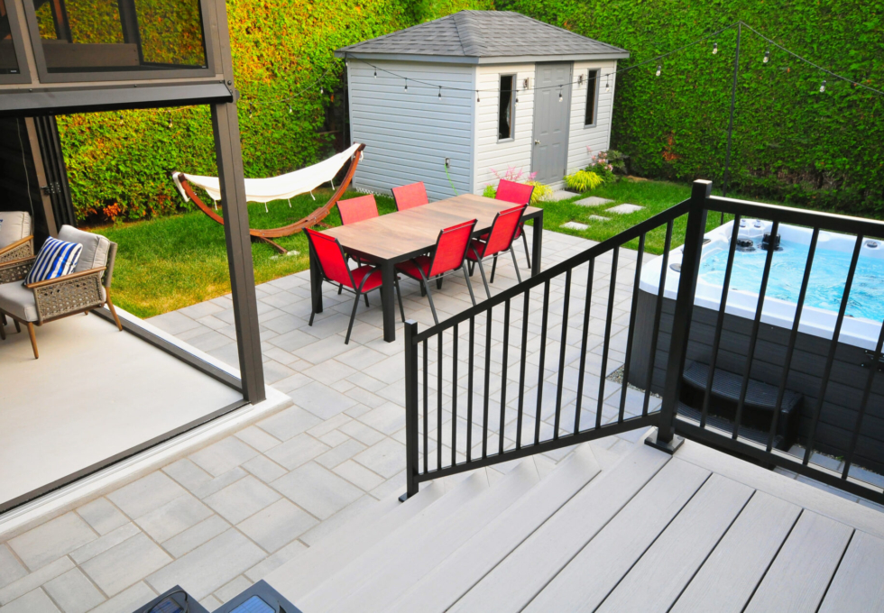 La cour arrière a été pensée comme un véritable espace de vie extérieur, propice à la détente et aux rassemblements. Un balcon en PVC TimberTech, collection Landmark, sécurisé par une rampe en aluminium noir, permet l’accès depuis la résidence.