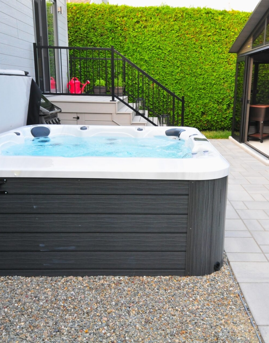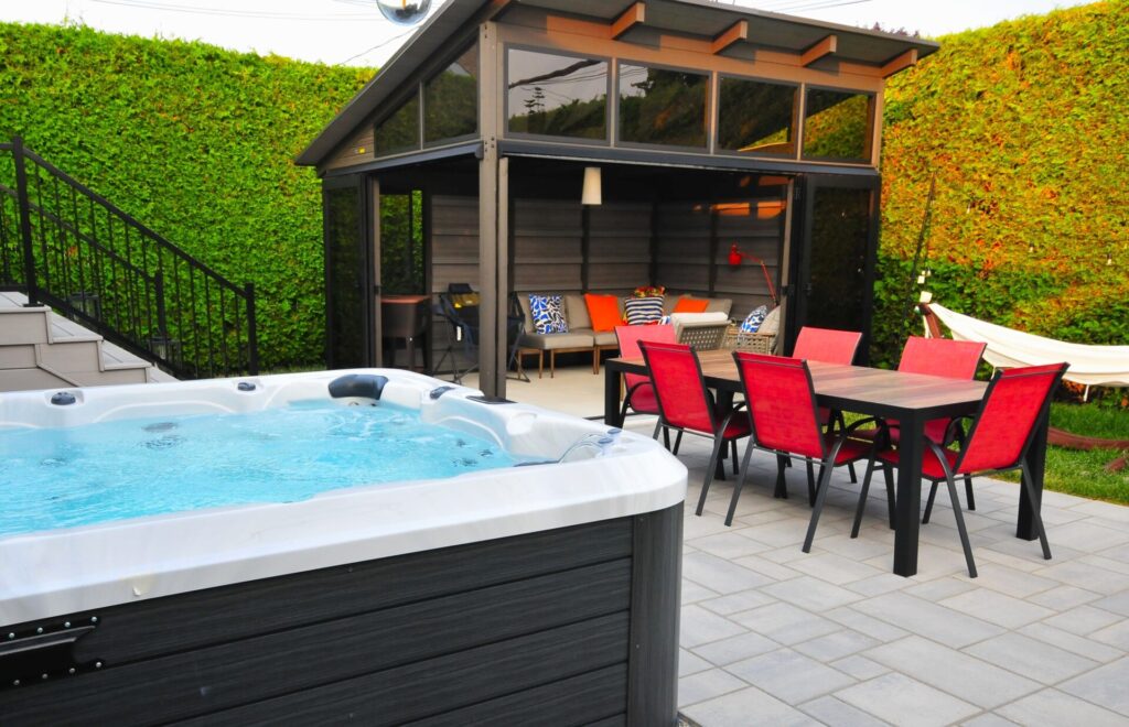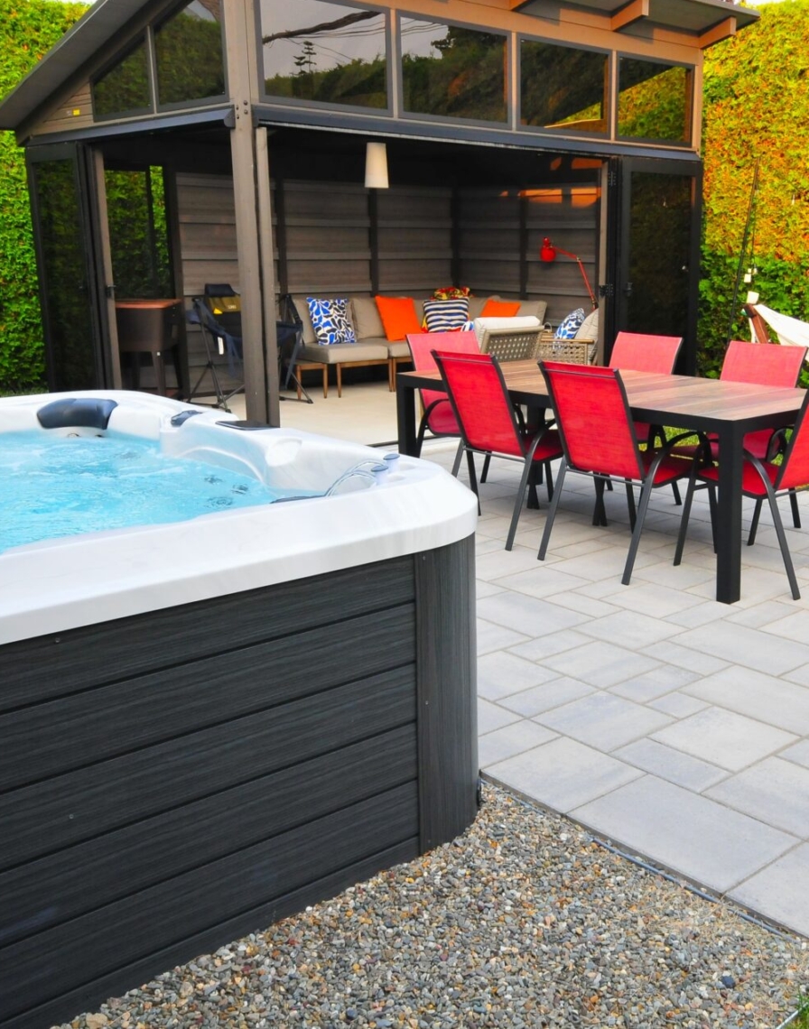 Un patio en dalles Blu Gris Calcaire accueille un coin repas convivial. Le pavillon extérieur, installé sur une dalle de béton, abrite un espace repos confortable comprenant sofa et chaises, idéal pour profiter de l’extérieur en toute saison. Un spa vient compléter l’aménagement, ajoutant une dimension de bien-être à l’ensemble.